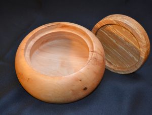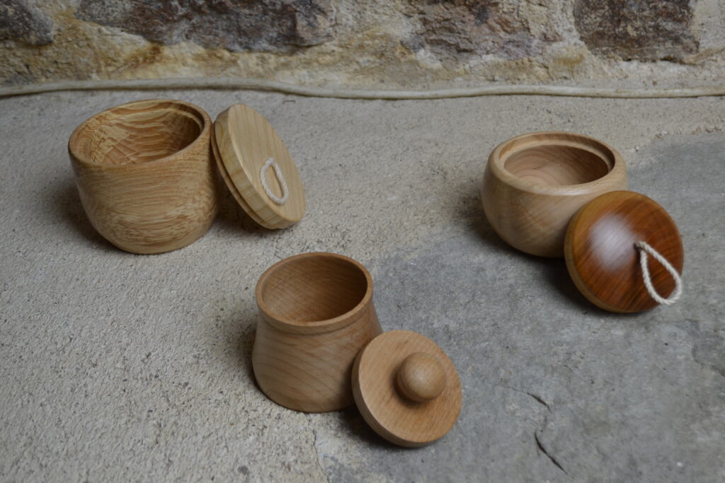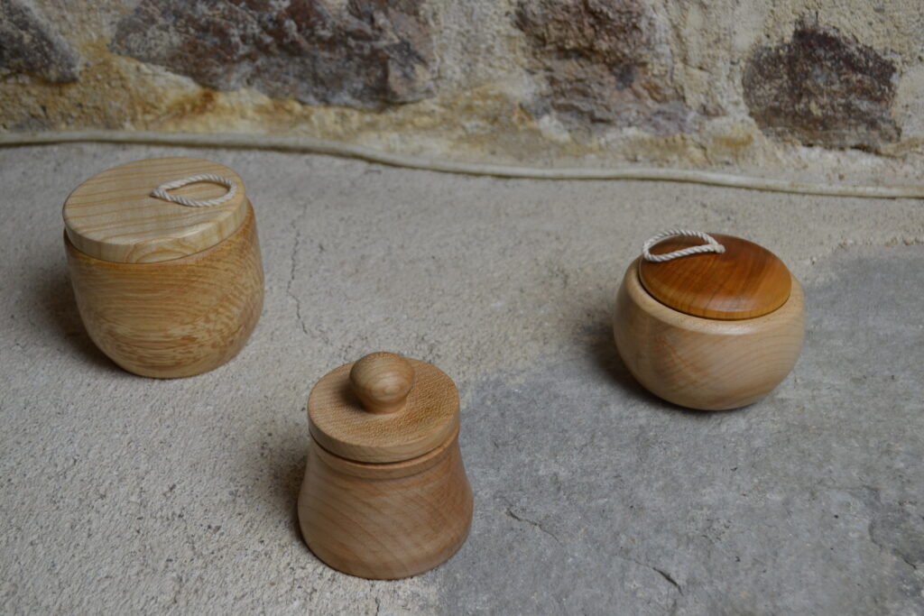 Boîtes en Bois (photos non contractuelles) Boîte rondeen merisier et hêtre échauffé(ht : 8,5 cm – Ø 16,5 )